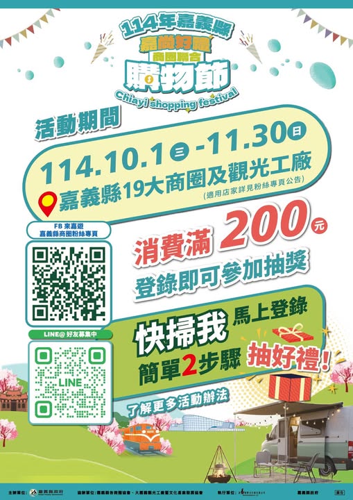 縣府誠摯邀請民眾把握最後一個月的黃金購物期,來嘉義縣走走逛逛,深度體驗各商圈的獨特風情與特色好物,不僅能享受優質的產品與服務,更有機會將露營車等超過200項大獎帶回家!