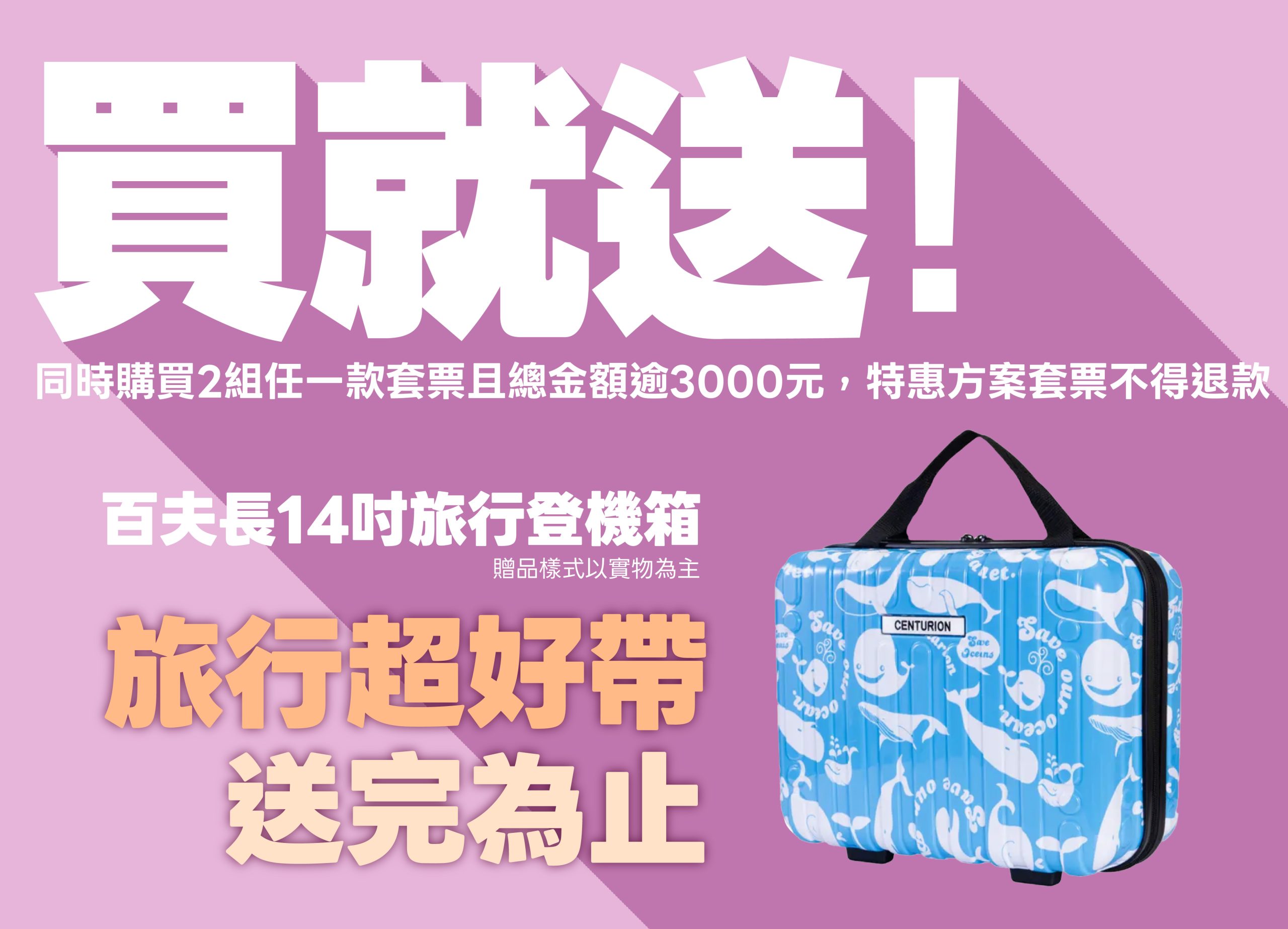 串聯皇冠海岸、大東北角和馬祖三大觀光圈山海溫泉、美食人文、永續旅遊體驗,探索北台灣全新魅力的北區觀光圈六款套票新登場。為鼓勵消費者運用綠色運具自遊北區觀光圈,特別推出特惠方案,只要一次購買二組任一款套票且總金額超過3000元,即送知名旅行登機箱一只,限量20組,送完為止。