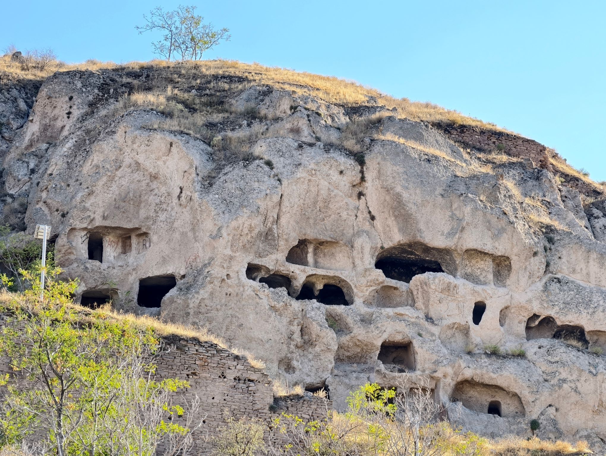 午後時分陽光灑下,人們顯得特別的慵懶,好個偷得浮生半日閒的美妙。步行約200公尺就能看見山岩壁上一個一個的洞窟,這就是塞爾柱帝國時期,百姓居住的地方,如此堅毅的岩石被人們鑿出一個又一個的生活區域,即便是遠處遙望也能感受當時百姓的生活不易。