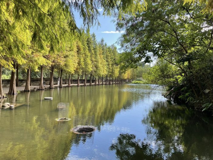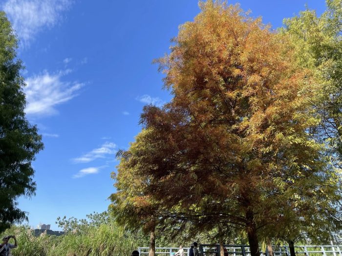 桃園大溪月眉人工濕地週邊種植近370棵落羽松,今年預計在12月下旬開始變色,紅黃交織的樹葉搭配藍天白雲倒映在水面上,有如置身在歐洲,這裡不需門票即可欣賞到絕世美景,是超熱門的打卡景點!