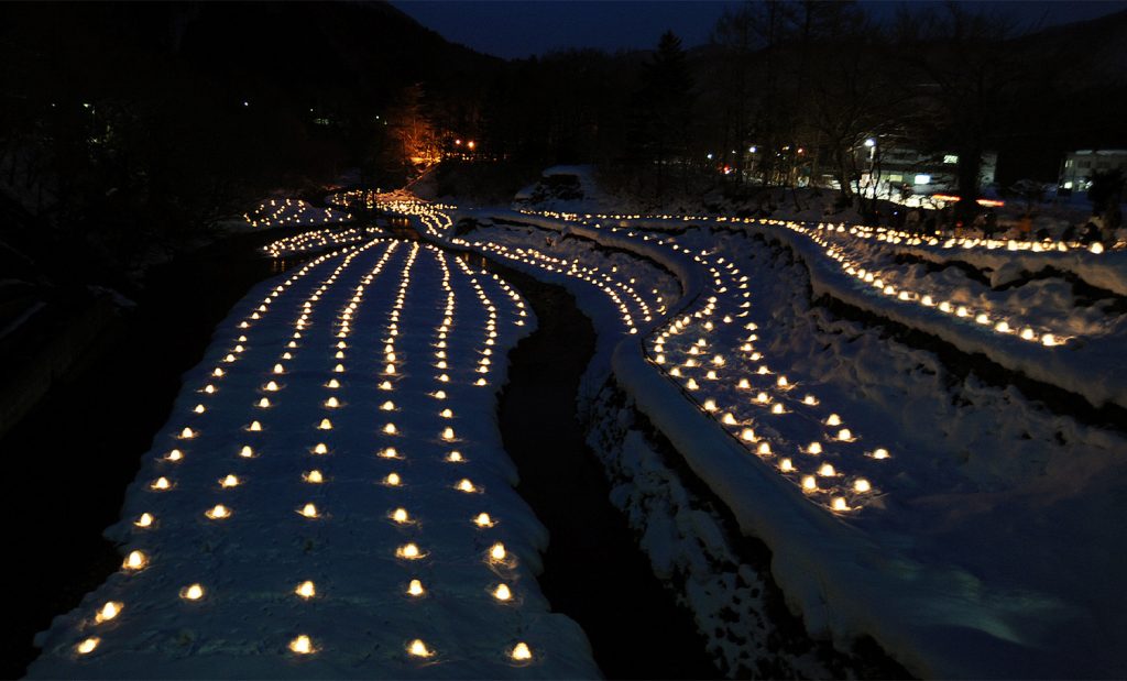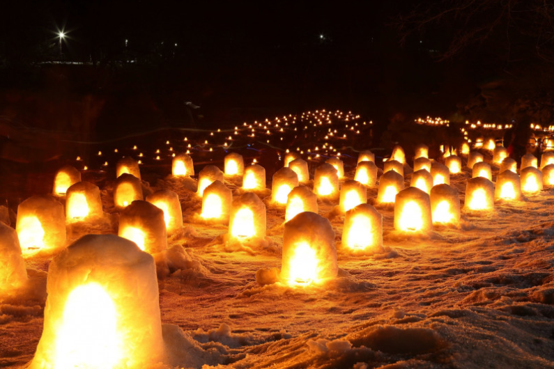 澤口河川敷在祭典期間會用雪堆起約800個小型的雪屋,迷你雪屋並排而立,每個雪屋都點亮了蠟燭,您可以欣賞到被認定為日本夜景遺產的夢幻景色。毎週五・六・日晚上17:30~21:00雪洞會點上燈火,微光閃爍在雪中,有如冰雪大地上的點點星光,讓人有如置身在幻想世界中,也被選為「死前也要來觀賞的絕景」之一。