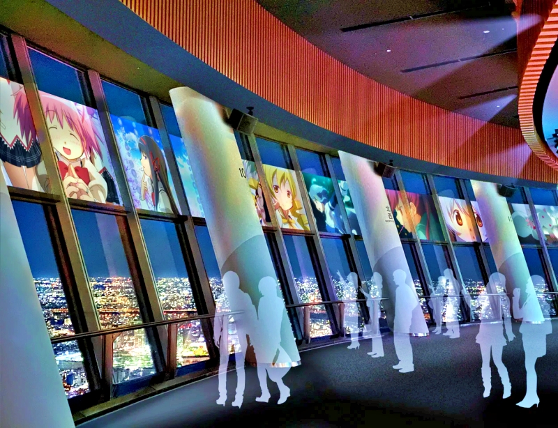 高450米的天望回廊設有以本次活動主視覺圖為主題的展覽。此樓層提供僅限活動期間發售的限定商品及特別咖啡廳菜單。此外,還設有活動專屬拍照服務,可供遊客與「PUELLA MAGI MADOKA MAGICA」角色合影留念。在高350米的天望甲板(Tembo Deck),活動期間每晚都會在晴空塔圓周大屏——即由窗戶改造而成的巨型螢幕上放映獨家視頻。同時,夜間塔樓外部也將呈現特別的「PUELLA MAGI MADOKA MAGICA」主題燈光秀,其設計靈感源自動畫中的多位角色。