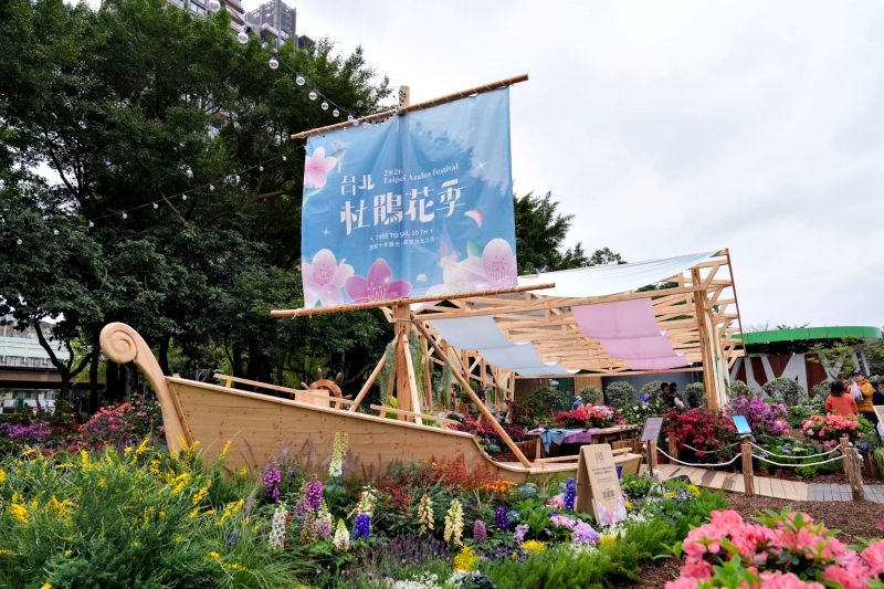 杜鵑花是臺北市的市花,更是許多市民共同的春日記憶,為呈現杜鵑花的多元樣貌,今年特別邀請榮獲 BERLIN DESIGN AWARDS 銀獎的王宏亨藝術家,以及隈研吾設計比賽最優秀獎得主王品淮藝術家共同創作大型方舟藝術裝置「拾花號 A’rk」。作品融合自然木構、花卉展示與在地花農共創成果,方舟內可欣賞到超過8大品系的杜鵑,還有桃園區農業改良場合作借展的「桃園1號」紅玫瑰杜鵑、「桃園2號」火炬杜鵑,以及自新北市金山產銷班借展的原生種杜鵑烏來杜鵑、自行雜交栽培品種杜鵑,使「拾花號」成為園區最具代表性的賞花與拍照亮點。
