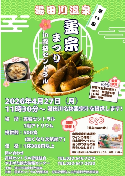 鶴岡・庄內的湯田川溫泉,是東北地方中以美食寶庫聞名的觀光勝地之一,孟宗竹是根植於山形縣庄內地區內的早春美味,春天到湯田川吃孟宗竹湯不僅是山形人的喜好,也吸引更多外地人專程「為了這個而來到湯田川」來湯田川旅遊,湯田川的旅館也越來越早被訂滿。第12回湯田川温泉孟宗祭將於4月27日舉辦當天會提供孟宗竹湯,一杯300日圓。